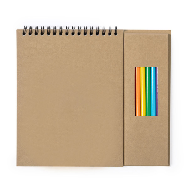 Tolles Bleistift- und Notizbuch-Set aus recyceltem Karton. Fensterbox mit 8 Bleistiften in sechseckiger Form in verschiedenen Farben. Inklusive Ringnotizbuch mit 6 Blatt Naturmotiven und 18 Blankoseiten.
