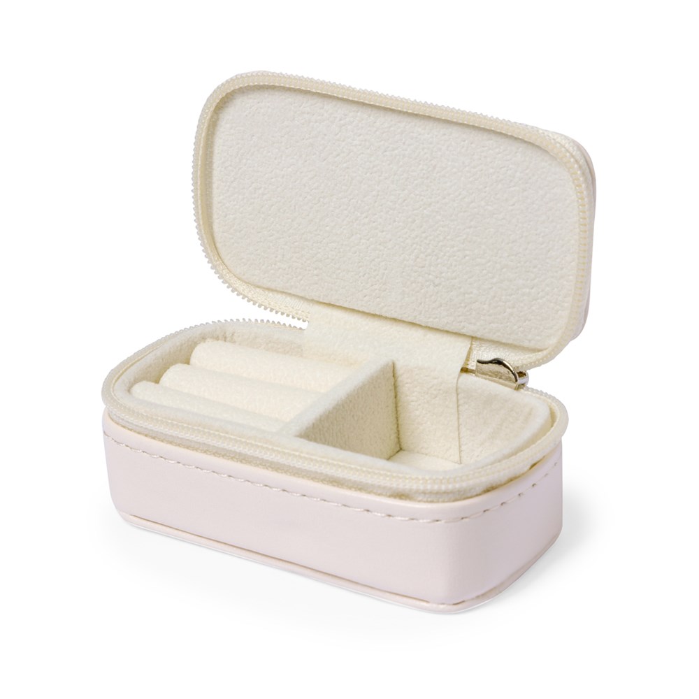 Schmuckkästchen aus PU-Leder. Natürliches Farbdesign mit Reißverschluss und zwei Innenfächern. Ein Fach in Form einer Schachtel und ein weiteres Fach mit Auflagen für Ringe und Ohrringe, ausgekleidet mit weichem Stoff. Präsentiert in einer individuellen Papiertüte.