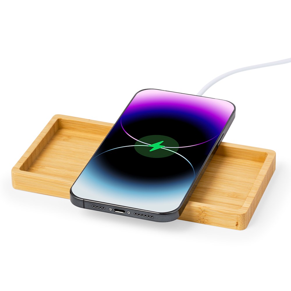 Kabelloses Ladegerät und Organizer 15W, aus Bambus. Mit Smartphone-Halterung und zusätzlichen Fächern für Gegenstände, kompatibel mit Geräten, die mit kabelloser Ladetechnik ausgestattet sind. Große Brandingfläche und präsentiert in einer individuellen Kraftbox. Gebrauchsanweisung in Englisch und Spanisch erhältlich.Materialien wie Bambus fördern die Verwendung von natürlichen Rohstoffen und reduzieren die Schadstoffemissionen. Es handelt sich um eine sehr widerstandsfähige und vielseitige Pflanze, die schnell wächst und sich regeneriert, was sie zu einer hervorragenden Alternative zu herkömmlichem Holz macht.Hergestellt gemäß den RoHS-Normen und unter Einhaltung der folgenden Sicherheitsanforderungen:Überhitzungsschutzsystem.Überladungsschutzsystem.Blockiersystem zur Vermeidung von Kurzschlüssen.
