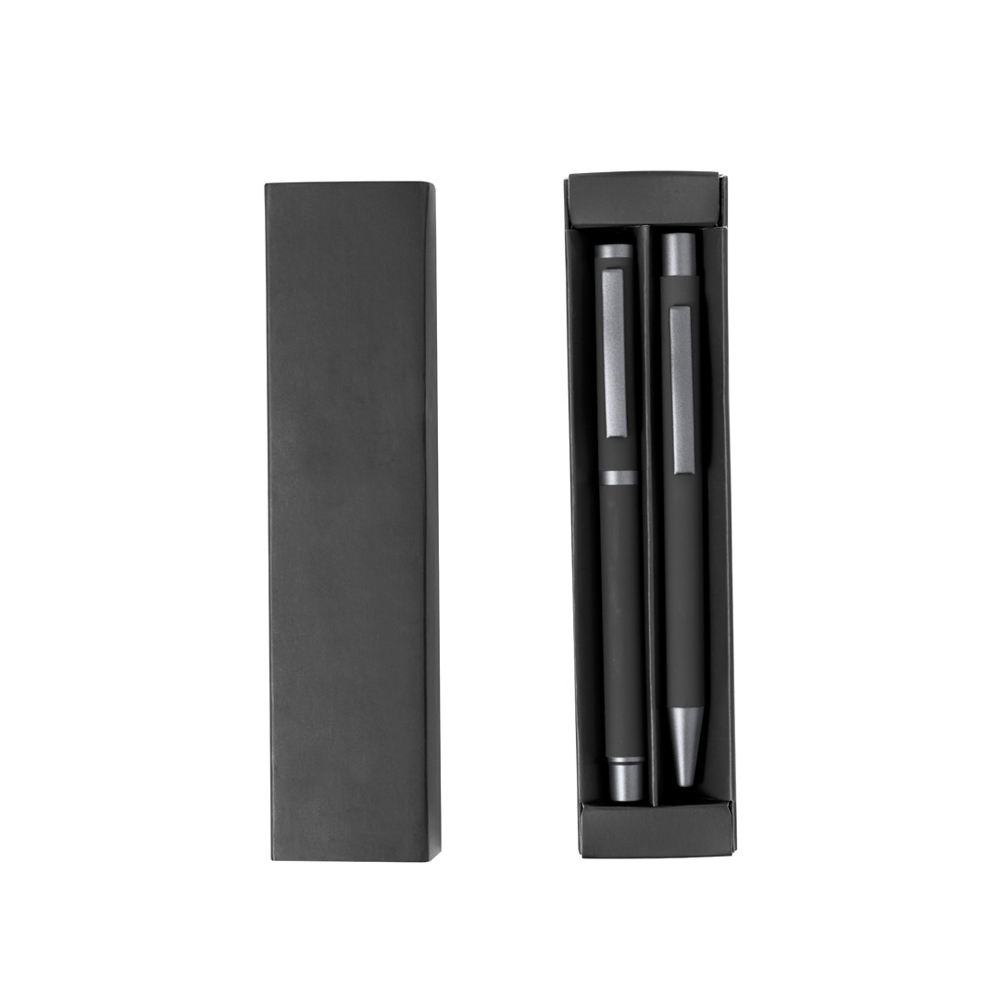 Stilvolles Kugelschreiber- und Tintenroller-Set. Druckkugelschreiber und Tintenroller mit Kappe, beide mit Metallclip, Jumbo-Mine und blauer Tinte. Schaft in verschiedenen Volltonfarben, mit gummierter Oberfläche und dunkelgrauen Metallic-Akzenten. Präsentiert in einem farblich passenden Etui mit einem ausgestanzten Fach für jedes Teil.