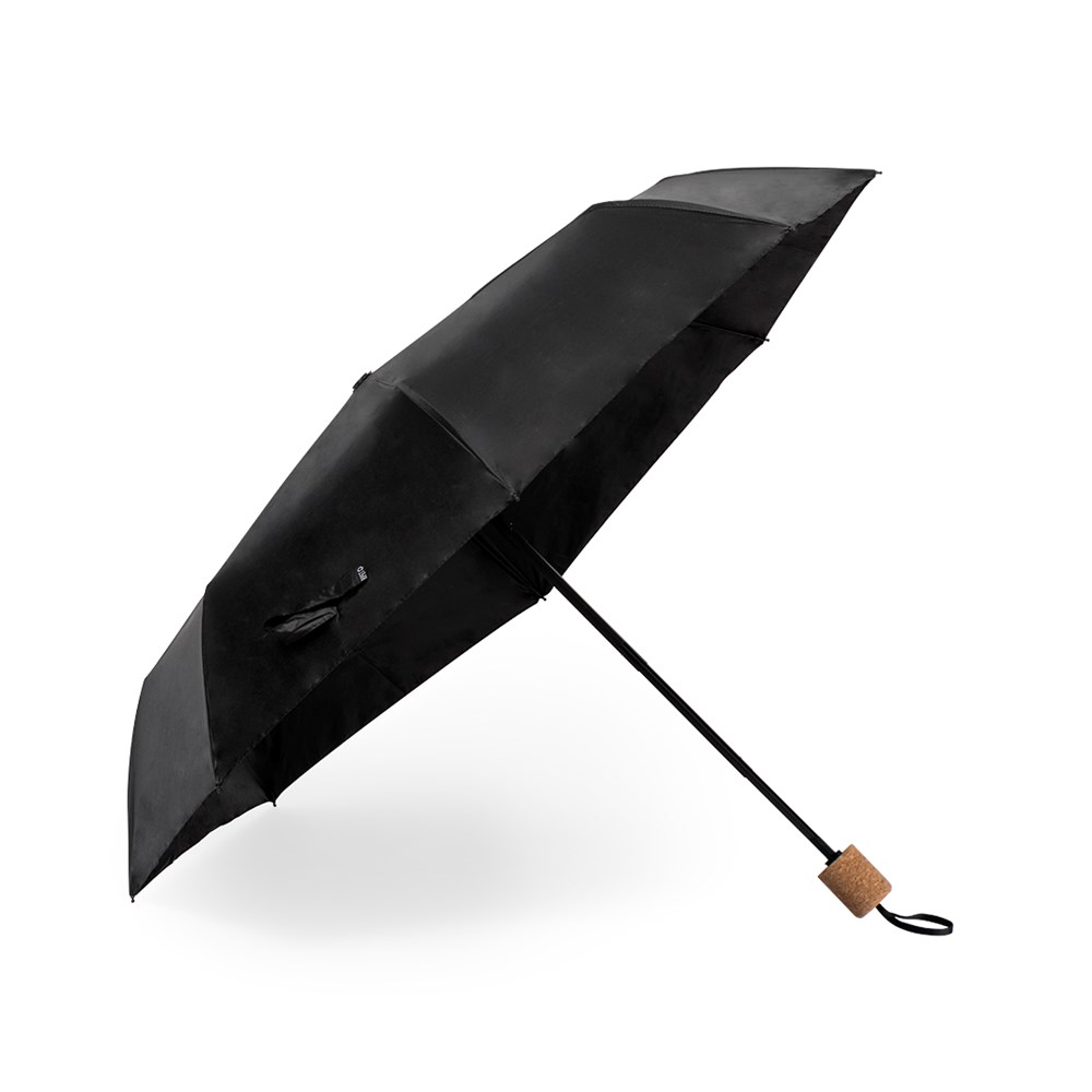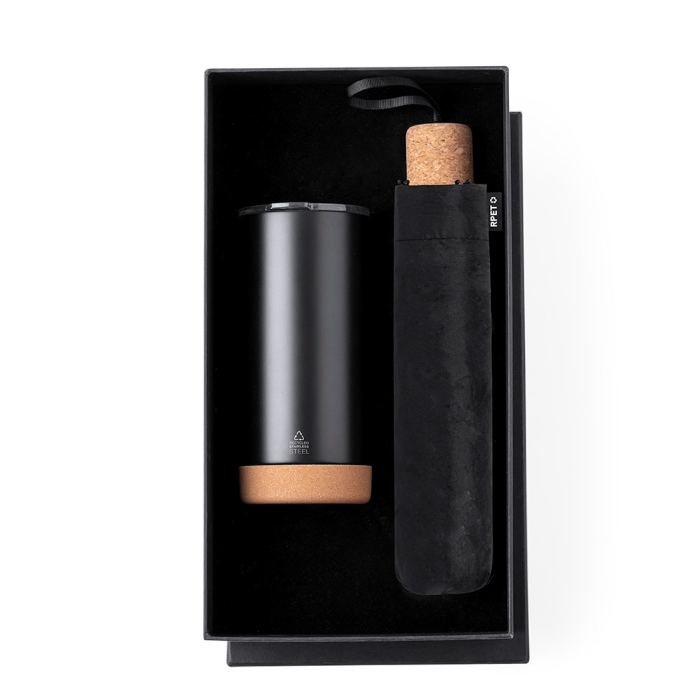 Stilvolles Premium-Set. Im Lieferumfang enthalten: Thermosbecher aus recyceltem Edelstahl mit Doppelwand und 550 ml Fassungsvermögen, in elegantem mattschwarzem Finish. Korkboden, mit Stülpdeckel und Spender. Es ist ideal für Ihren Schreibtisch, Tisch oder jede andere Oberfläche, auf der Sie in Ruhe Ihr Lieblingsgetränk genießen können. Faltbarer schwarzer Regenschirm mit 98 cm Durchmesser. Aus 190T RPET-Pongee-Material und mit Korkgriff. Manuelle Öffnung, mit winddichtem Mechanismus und Glasfaserrippen. Mit markantem RPET-Label. Das Set wird in einer individuellen matten Hülle geliefert und verfügt über eine Innenstanzung für jedes Element des Sets. Das RPET-Material wird aus recyceltem Kunststoff hergestellt, was die Wiederverwendung von Kunststoffabfällen fördert und zur Nachhaltigkeit des Planeten beiträgt.