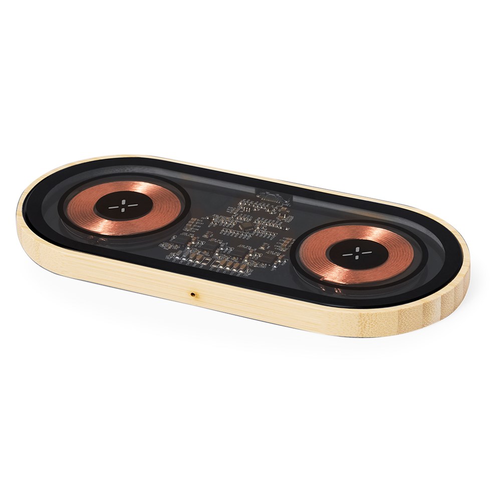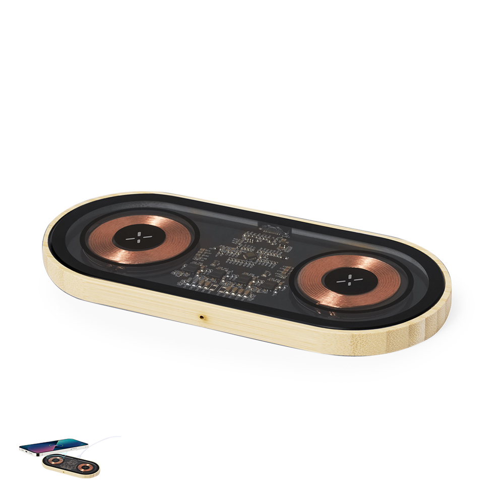 Dual-15W-Wireless-Ladegerät in einem originellen Design mit einer transparenten Oberfläche, die die internen Komponenten des Geräts zeigt. Mit Bambusbasis, kompatibel mit Geräten mit Qi-Technologie und ermöglicht es auch, zwei Geräte gleichzeitig aufzuladen. Typ C Verbindung, mit Anleitung in Englisch und Spanisch. Präsentiert in einer individuellen Kraft Design-Box.Materialien wie Bambus fördern die Verwendung natürlicher Rohstoffe und reduzieren die Schadstoffemissionen. Es stammt von einer sehr widerstandsfähigen und vielseitigen Pflanze mit schnellem Wachstum und Regeneration, was es zu einer ausgezeichneten Alternative zu traditionellem Holz macht.Hergestellt nach RoHS-Standards und in Übereinstimmung mit den folgenden Sicherheitsanforderungen:Überhitzungsschutzsystem.Überladungsschutzsystem.Blockiersystem zur Vermeidung von Kurzschlüssen.