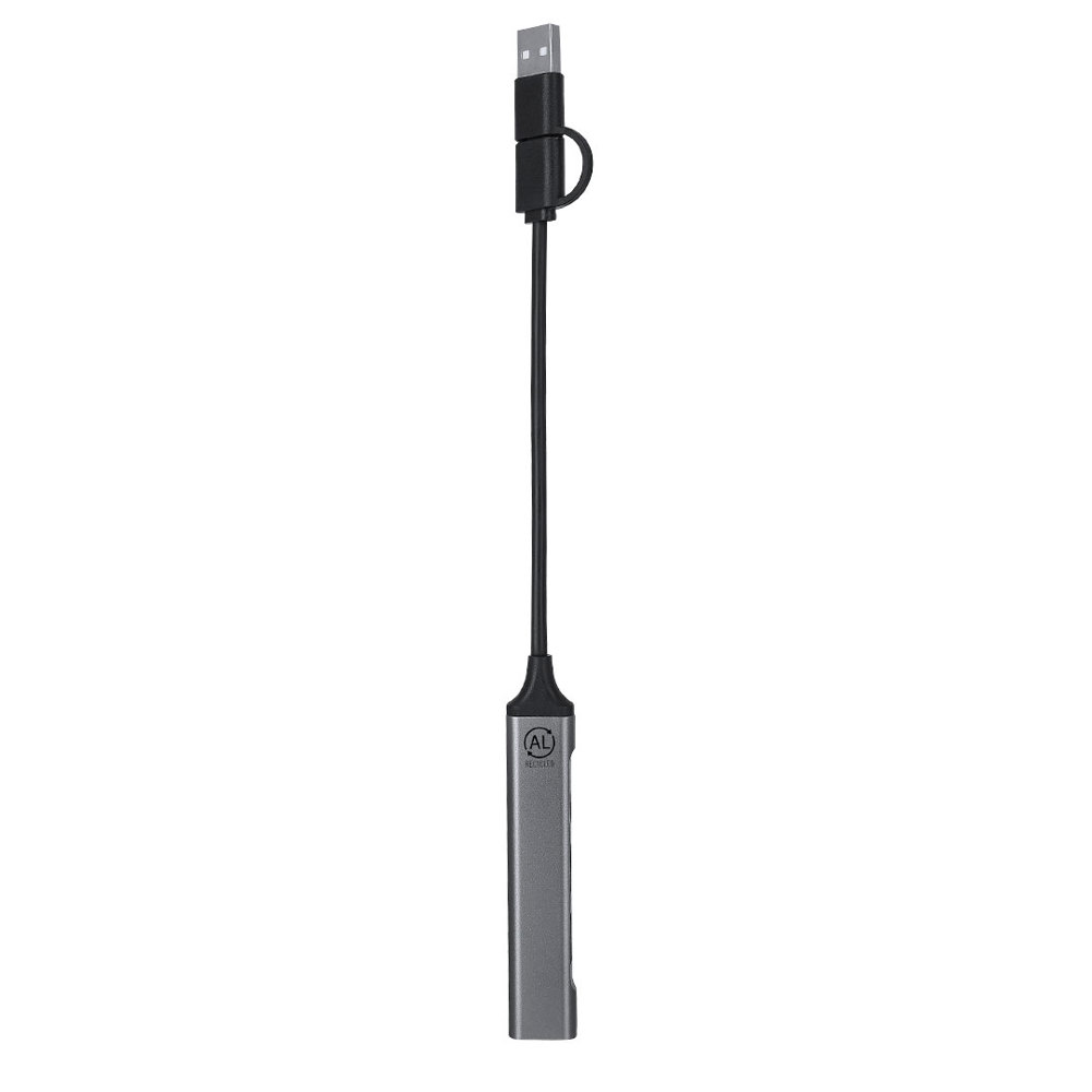USB Hub aus recyceltem Aluminium. Mit dualem USB/Typ C-Anschluss und 4 Ports: 1 Typ C-Anschluss 2.0 und 3 USB-Ports. Mit Logo aus recyceltem Aluminium.Recyceltes Aluminium ist ein Material mit nahezu unendlichen Recyclingmöglichkeiten, ohne seine ursprünglichen Eigenschaften zu verlieren und dabei weniger Energie zu verbrauchen.GRS (Global Recycled Standard)-Zertifizierung, die den recycelten Ursprung des zur Herstellung des Produkts verwendeten Materials garantiert.
