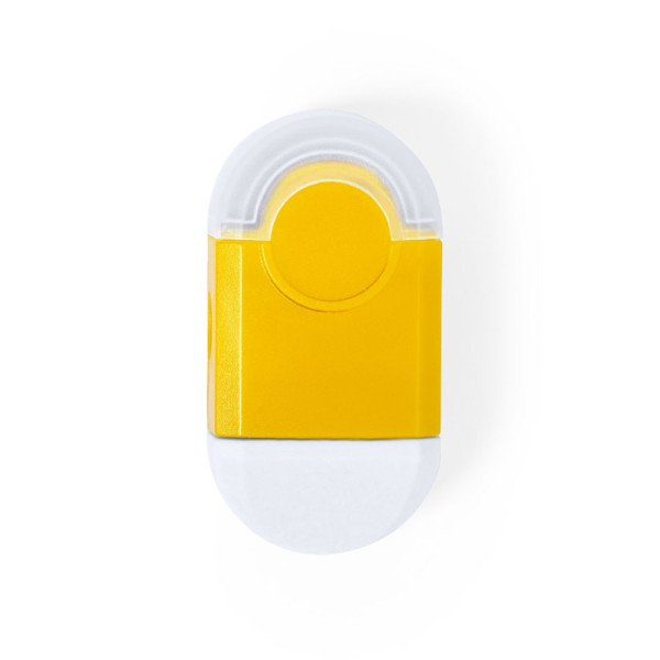 Set aus Radiergummi und Anspitzer in lebendigen Farben. Auffangbehälter mit transparentem Deckel.