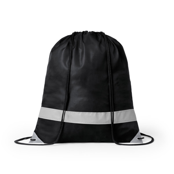 Reflektierender Rucksack mit Kordelzug aus weichem 190T Polyester in lebendigen Farben mit reflektierender Frontleiste. Mit Zugbändern in Schwarz und reflektierenden, mit Metallösen verstärkten Ecken.