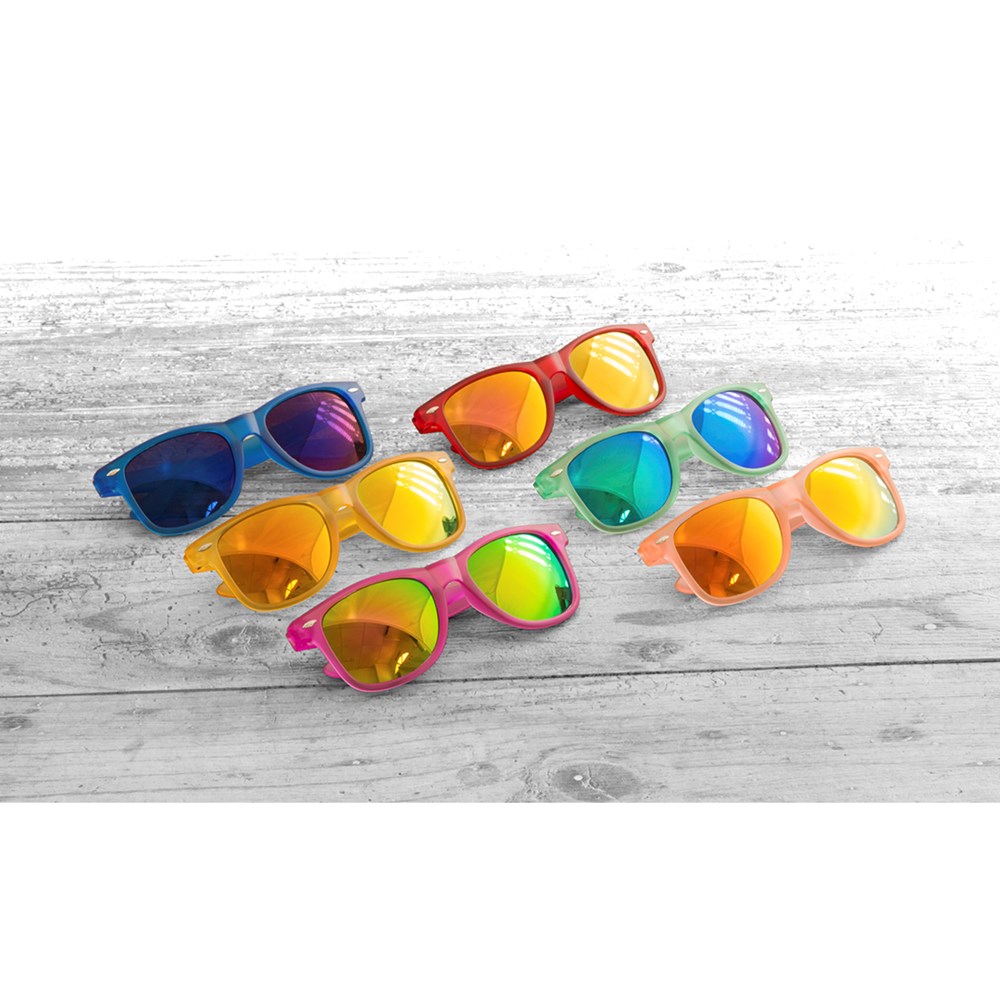 Sonnenbrille mit UV-400-Schutz mit klassischem Design und halbtransparentem Rahmen in fröhlichen Farben sowie farblich passenden, verspiegelten Gläsern.