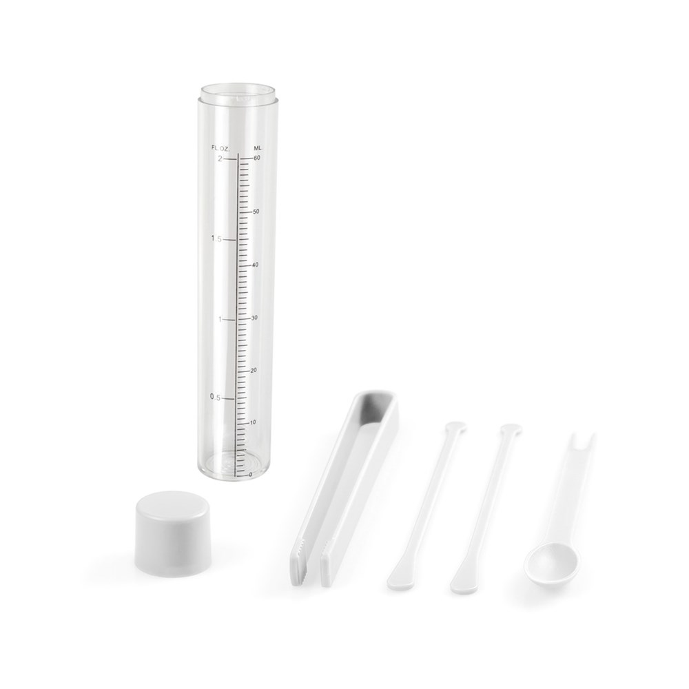 5-teiliges Cocktail-Set in verschiedenen kräftigen Farben. Enthält Messbecher mit 60 ml Fassungsvermögen, Cocktaillöffel, Zange und zwei Rührer.
