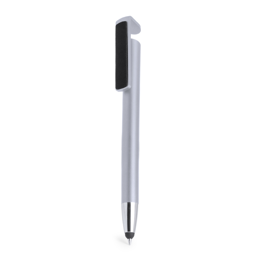 Multifunktioneller Druck-Kugelschreiber in kräftigen Farben mit speziellem Clip mit doppelter Funktion: Ständer für Mobilgeräte und Bildschirmreiniger. Mit Metallschaft - speziell entwickelt für den Tampondruck. Schwarze Tinte.