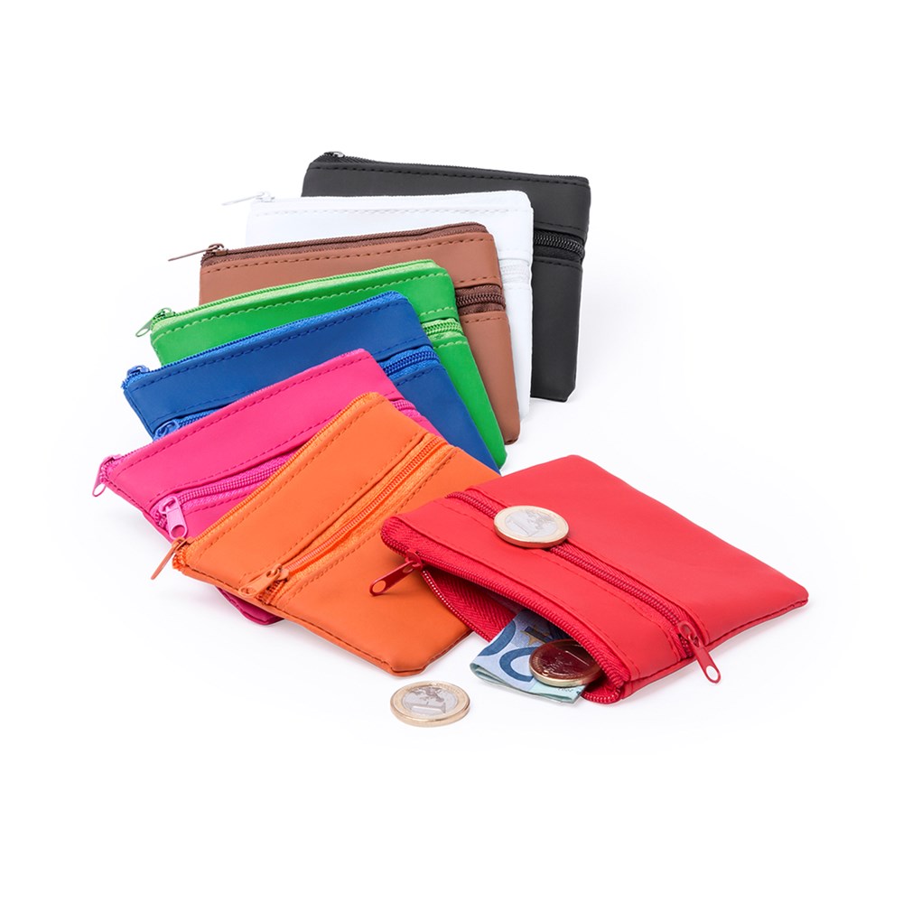 Geldbörse mit lebhaftem Design aus weichem Kunstleder in verschiedenen kräftigen Farben. Hauptfach und Fronttaschen mit farblich passendem Reißverschluss. Innenfutter in passender Farbe.