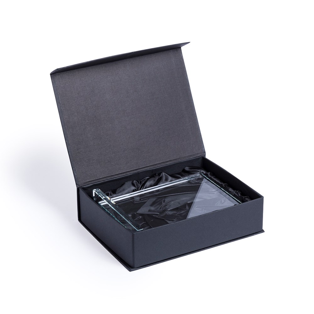 Trophäe aus dickem Glas mit elegantem rechteckigem Design und robustem Standbein. Speziell für den Laserdruck entwickelt. Präsentiert in einem individuellen Schutzcase.