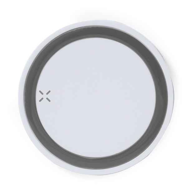 Zweifarbiges rundes kabelloses Ladegerät. Mit rutschfester Unterseite und LED-Anzeige für den Ladestatus. Kompatibel mit Smartphones mit kabelloser Ladetechnologie und präsentiert in einer attraktiven Designbox.
