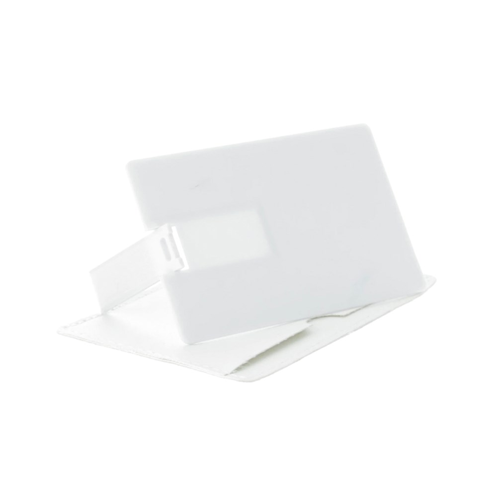 USB-Speicher mit 16 GB Kapazität in Kartenform. Mit ultra flachem Design und Klappmechanismus. Speziell für den digitalen Vollfarbdruck entworfen. Präsentiert in einem eleganten Kunstleder-Etui in Weiß.
