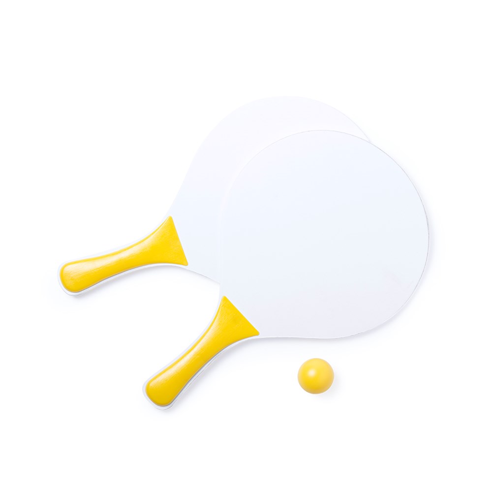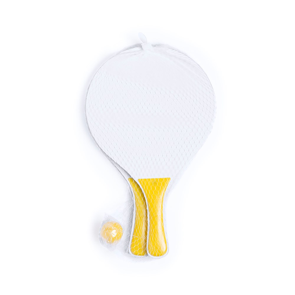 Beachball-Set mit zwei Schlägern aus Naturholz in Weiß. Mit verstärktem Griff in verschiedenen lebendigen Farben. Präsentiert in einer Netztasche mit Ball in passender Farbe.