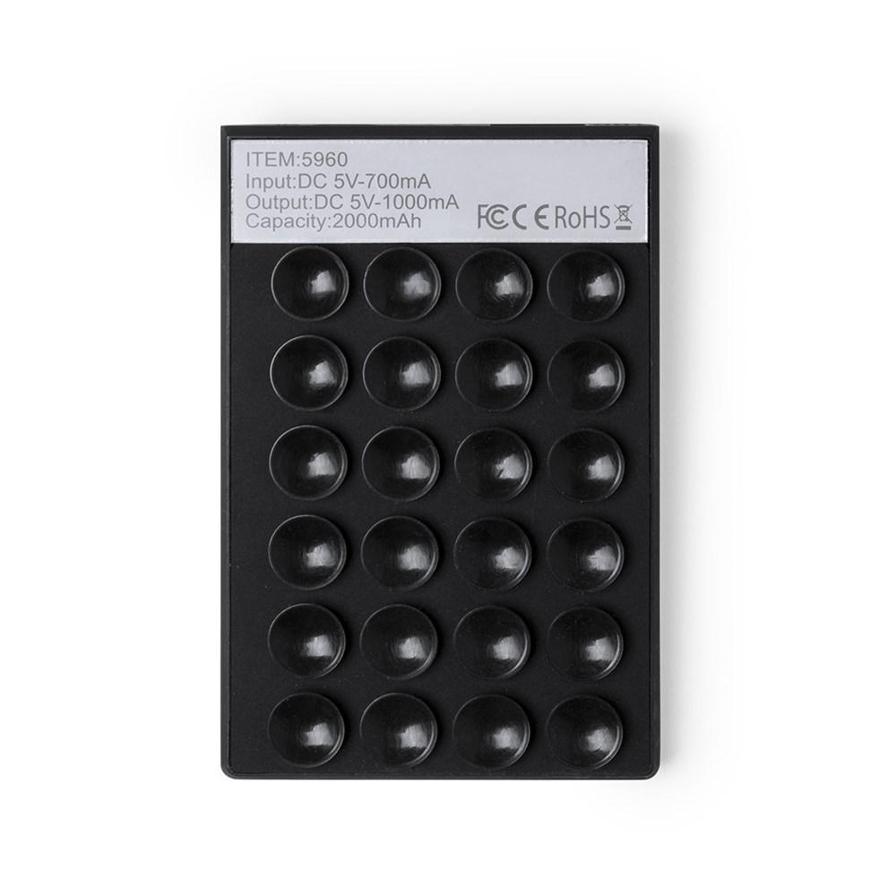 Externe Powerbank - 2.000 mAh - mit Saugnapf und Selfie-Ring/Halterung. Mit Anschlüssen für Micro-USB und USB-Eingang/-Ausgang. Ladestatusanzeige-LEDs, flaches gewölbtes Design und große Druckfläche. Präsentiert in einer attraktiven Designerbox. Die Kapazitäten aller unseren externen Zusatzbatterien sind real und beinhalten alle Batterien der Klasse A und nicht recycelte Batterien, mit einer Lebensdauer von mindestens 500 Ladezyklen und sind CE-konform. Darüber hinaus werden sie gemäß den RoHS-Normen und in Übereinstimmung mit den folgenden Sicherheitsanforderungen hergestellt: Überladeschutzsystem der Powerbank, vollständiger Entladungsschutz für eine längere Lebensdauer der Powerbank, verriegelungssystem zur Vermeidung von Kurzschlüssen, konstantes Ladungstransfersystem je nach Kapazität des Zielgeräts. nbsp