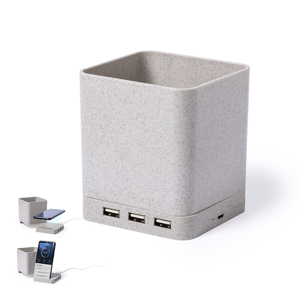 4 in 1 Multifunktionsstifthalter aus unserer Naturlinie. Hergestellt aus Weizenstroh, um die Verwendung natürlicher Rohstoffe zu fördern und Schadstoffemissionen zu reduzieren.Mit Stifthalter, Smartphone-Halter, drahtlosem Ladegerät und USB-Port (3xUSB 2.0) Funktionen. Kompatibel mit Smartphones, die mit drahtloser Ladetechnologie ausgestattet sind. Inklusive 1 Meter langem, weißem Mikro-USB-Kabel. Präsentiert in einer attraktiven Ökodesign-Box. Bedienungsanleitung in Spanisch und Englisch erhältlich.