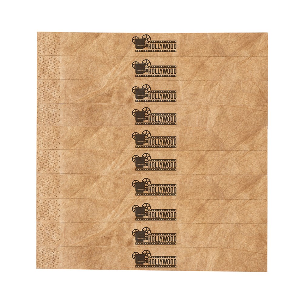 Event-Armband mit Naturfinish. Hergestellt aus Tyvek®-Kunstfaser, die sich besonders durch ihre Widerstandsfähigkeit, Langlebigkeit und leichte Bedruckbarkeit auszeichnet. Wasserdicht und mit Klebeverschluss, Einheitsgröße für Erwachsene. Präsentiert in einem 10-teiligen gestanzten Bogen mit individueller Nummerierung.