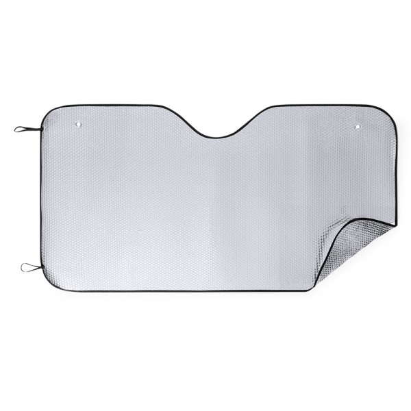 Sonnenschutz aus Aluminum in Silber-Metallic mit schwarzer Paspelierung. Maxi-Größe mit den Maßen 143 x 74 cm. Mit Gummibändern zum Fixieren im gefalteten Zustand, Metallösen zur Verstärkung, sowie zwei Saugnäpfen für die Befestigung an der Windschutzscheibe. Präsentiert in ungefaltetem Zustand für einfaches Bedrucken.