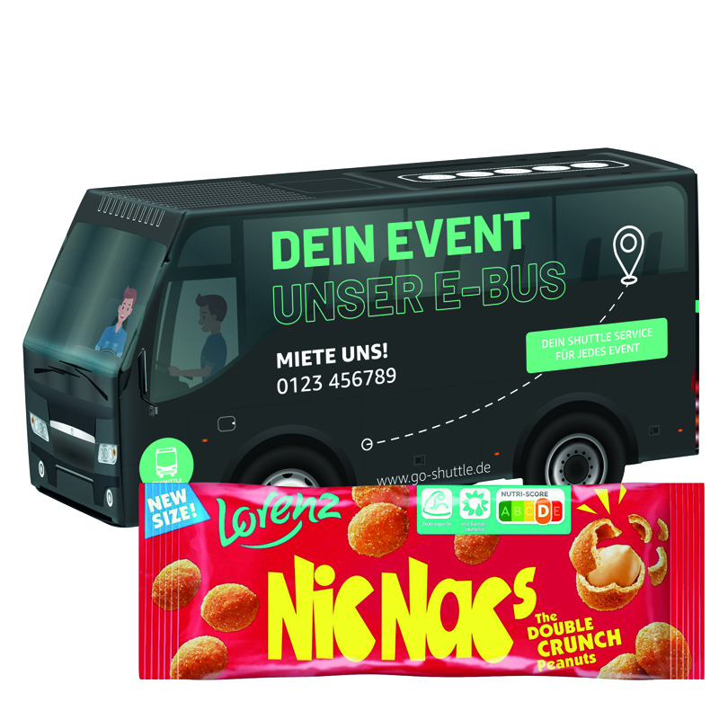 Bus Verpackung aus weißem Karton, individuell bedruckt. Inhalt: 1 Tütchen Lorenz Nic Nac‘s Erdnüssen im Teigmantel, 35 g