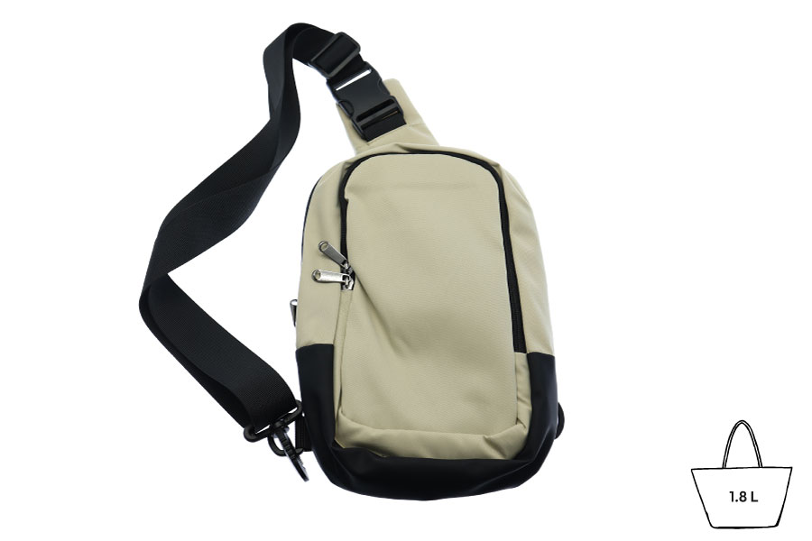 Aus Polycotton 160g/m². 2 große Stauräume mit Reißverschluss, jeweils mit einer Trennwand. Komplett gefütterte Innenräume. Rückseite des Produkts gepolstert. Verstärkung aus Kunstleder unter der Tasche. Verstellbarer Schulterriemen aus Nylon. Kann links oder rechts getragen werden. Volumen: 1,8 L.