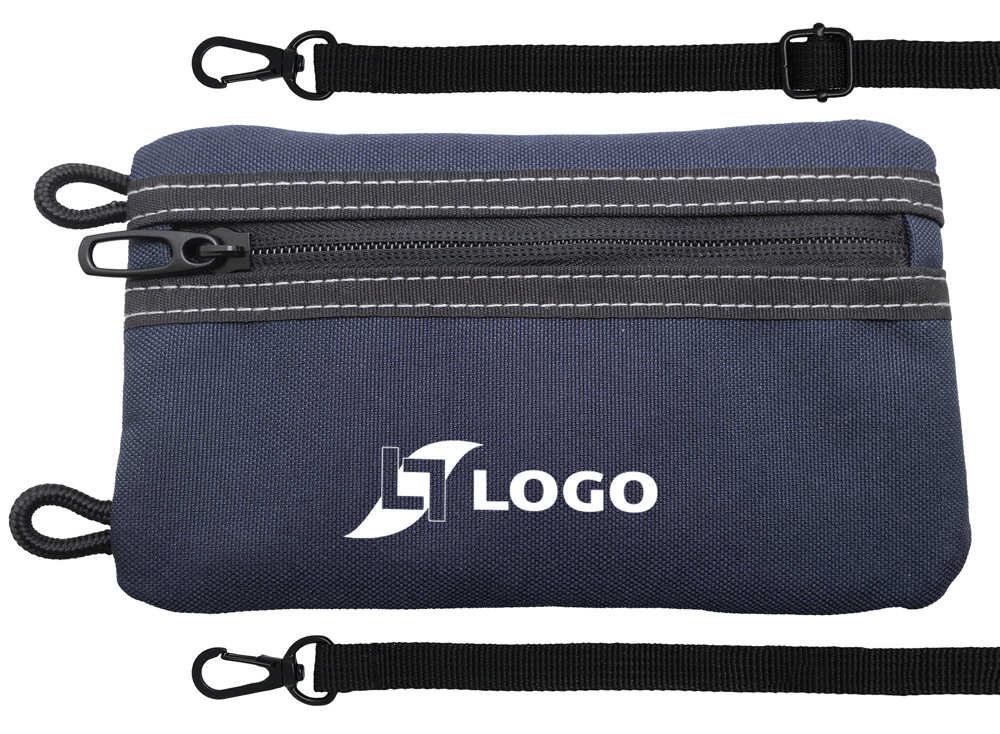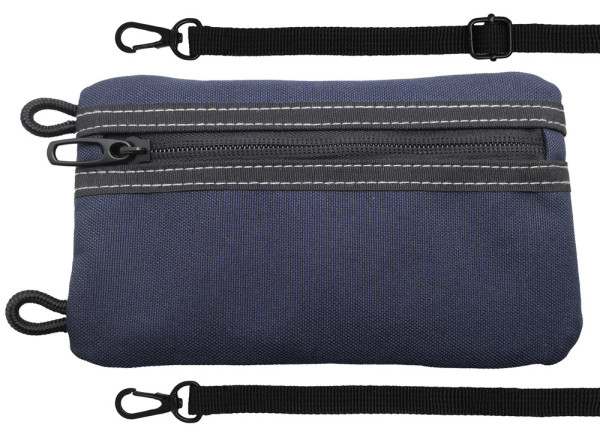 Aus Polyester 900D (420g/m²). 1 Aufbewahrungsfach (auch als Geldbörse benutzbar) mit Reißverschluss und 4 zusätzliche Fächer an der Außenseite, von denen eines für ein Smartphone und drei für einen Stift, ein Taschenmesser usw. vorgesehen sind. Schulterriemen aus Nylon.