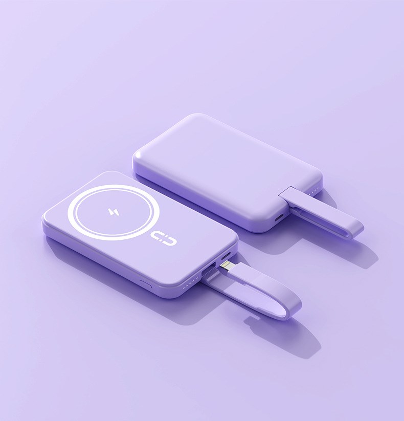 Wireless-Powerbank mit magnetischer Ladefläche und integriertem Ladekabel (USB-C & Lightning). Zur Haftung benötigt das Smartphone eine magnetische Rückseite oder ein magnetisches Ladecase. Kapazität: 10.000 mAh. Maße: ca. 108 x 68 x 19 mm. Farben: weiß, hellblau, lila. Input USB-C: 5V/3A, 9V/2A, 12V/1.5A. Output USB-C & Lightning: 5V/ 3A, 9V/2.2A, 12V/1.6A. Wireless Output: 15W. Veredelung: 1c Druck an einer Position inklusive. Verpackung: weiße Faltschachtel.