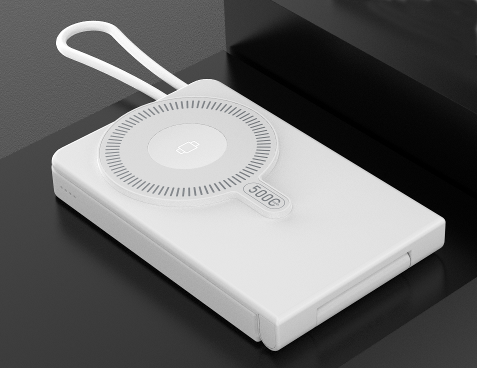 Wireless-Powerbank mit magnetischer Ladefläche, aufstellbar, mit integriertem Ladekabel und Spiegel. Zur Haftung benötigt das Smartphone eine magnetische Rückseite oder ein magnetisches Ladecase. Kapazität: 5.000 mAh. Maße: ca. 112 x 69 x 13,5mm. Input USB-C Port: PD 18W. Input via integriertem USB-C Kabel: PD 18W. Output via Integriertem USB-C Kabel: PD 20W. Wireless Output: 15W für Smartphones, 2.5W für Watches, 3W für In Ears. Farben: weiß, schwarz, gold. Veredelung: 1c Druck an einer Position inklusive. Verpackung: weiße Faltschachtel.