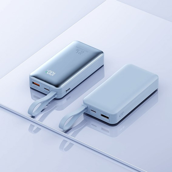 Handliche Powerbank mit 10.000 mAh und integriertem USB-C / Lightning Ladekabel und digitaler Akkuanzeige. Kapazität: 10.000 mAh. Maße: ca. 105 x 53 x 25 mm. Input / Output USB-C: 5V3A,9V2A,12V/1.5A,10V/2.25A. Output USB-A: 5V3A,9V2A,12V/1.5A,10V/2.25A. Output integriertes USB-C Kabel:5V3A,9V2A,12V/1.5A,10V/2.25A. Output integriertes Lightning Kabel: 5V/2.4A. Farben: beige, schwarz, lila, hellblau. Veredelung: 1c Druck an einer Position inklusive. Verpackung: weiße Faltschachtel