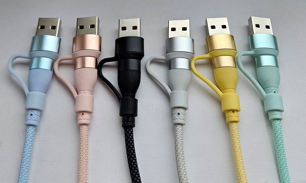 Lade- und Datenkabel mit USB-C und USB-A Input, mit hochwertiger Nylonummantelung. Input: USB-C mit USB-A Adapter, Output: USB-C (3A) mit Lightning Adapter. Länge: ca. 100 cm. Farben: schwarz, weiß, hellblau, hellgelb, rosa, mintgrün. Veredelung: Lasergravur an einer Position inklusive. Verpackung: Polybeutel.