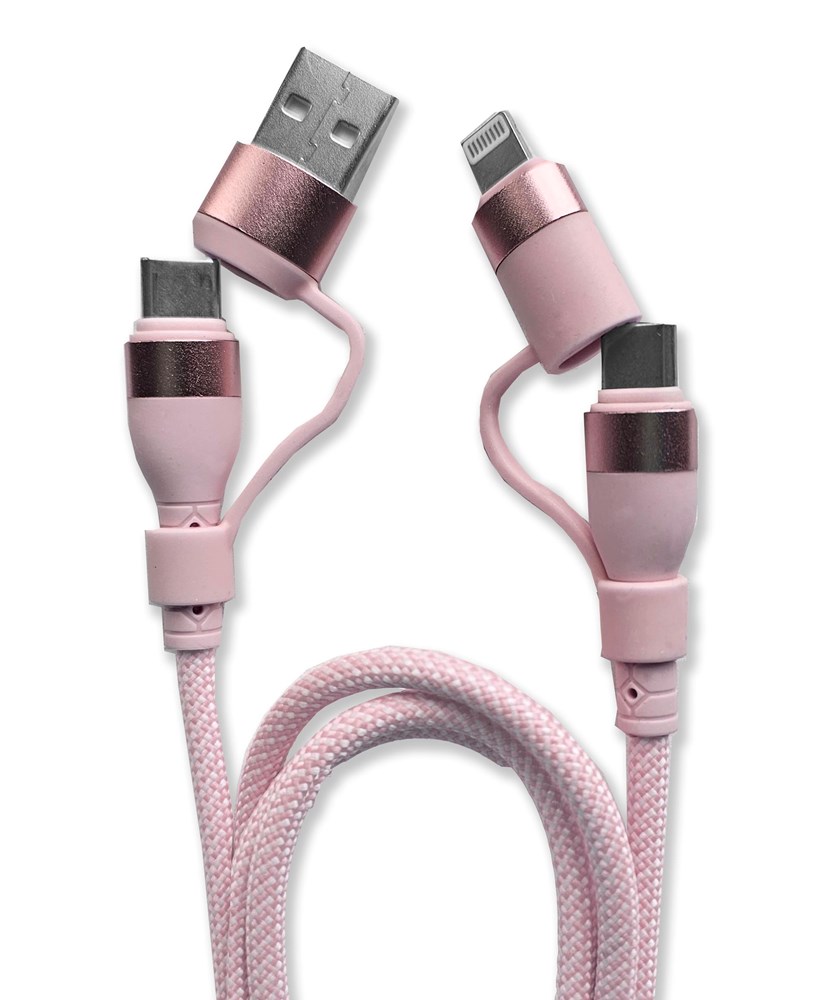 Lade- und Datenkabel mit USB-C und USB-A Input, mit hochwertiger Nylonummantelung. Input: USB-C mit USB-A Adapter, Output: USB-C (3A) mit Lightning Adapter. Länge: ca. 100 cm. Farben: schwarz, weiß, hellblau, hellgelb, rosa, mintgrün. Veredelung: Lasergravur an einer Position inklusive. Verpackung: Polybeutel.