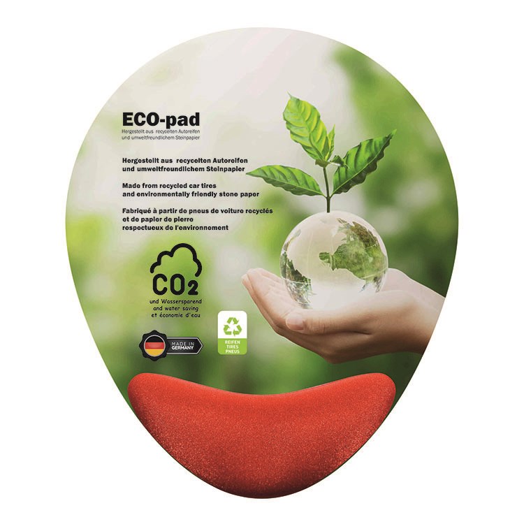 ERGO ECO-pad Mauspad Made in Germany Unterseite aus 100 % in Deutschland recycelten Autoreifen ( 75 % Anteil vom Artikel) Oberfläche: 0,3 mm umweltfreundliches Steinpapier das in der Herstellung nur einen Bruchteil der Energie und Wasser benötigt. CO2 wird bei 1 to Steinpapier = 474 KG und bei normalem Papier ca. 1431 KG produziert. Druck UV-Offset, Unterseite: 1 mm Recyclinggummi Mit ergonomischer Handballenauflage gefüllt mit Memoryschaum für gesundes Arbeiten Gesamtstärke : ca. 2 mm. Druck: Offsetdruck in 4-c CMYK + Mattlack , Druckverfahren: UV-Offsetdruck auf der Oberseite der Oberfläche. Wichtiger Hinweis! Es handelt sich um ein Produkt mit großem Anteil an Recycling und Naturmaterial. Die Lage aus Recycelten Autoreifen weist Unterschiede bis zu +/- 1 mm in der Dicke auf. Zudem können im Material Reifenteile leicht herausstehen, was auf der Oberfläche zu Unebenheiten führen kann und bei Benutzung der Maus in seltenen Fällen ( unter 3 % der Bestellmenge ) zu Farbablösungen auf der Oberseite der Mauspads. Das Steinpapier hat eine weiße Grundfarbe. Wird Steinpapier gestanzt ergibt dies weiße Ränder, die bei dunklen Hintergründen im Druckmotiv sichtbar werden. Weisen Sie auf die Verwendung der speziellen Materialien auf dem Mauspad hin. Wir unterstützen Sie gerne mit Vorlagen. Nur ein Mauspad ohne Hinweis auf die verwendeten Materialien zu produzieren, reduziert die Werbewirkung.