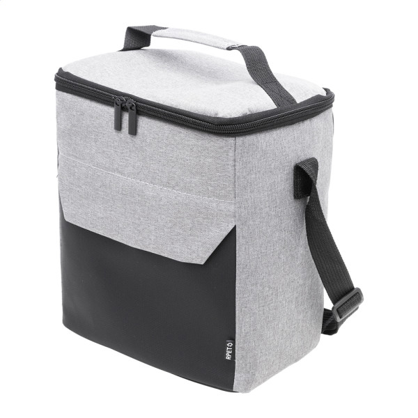 Kühltasche mit Reißverschluss aus RPET mit PU-beschichteten Applikationen und PEVA-Polsterung. Mit Tragegriff, verstellbarem Schultergurt und kleiner Vordertasche. Material: 600D RPET-Polyester. Mit RPET-Label.