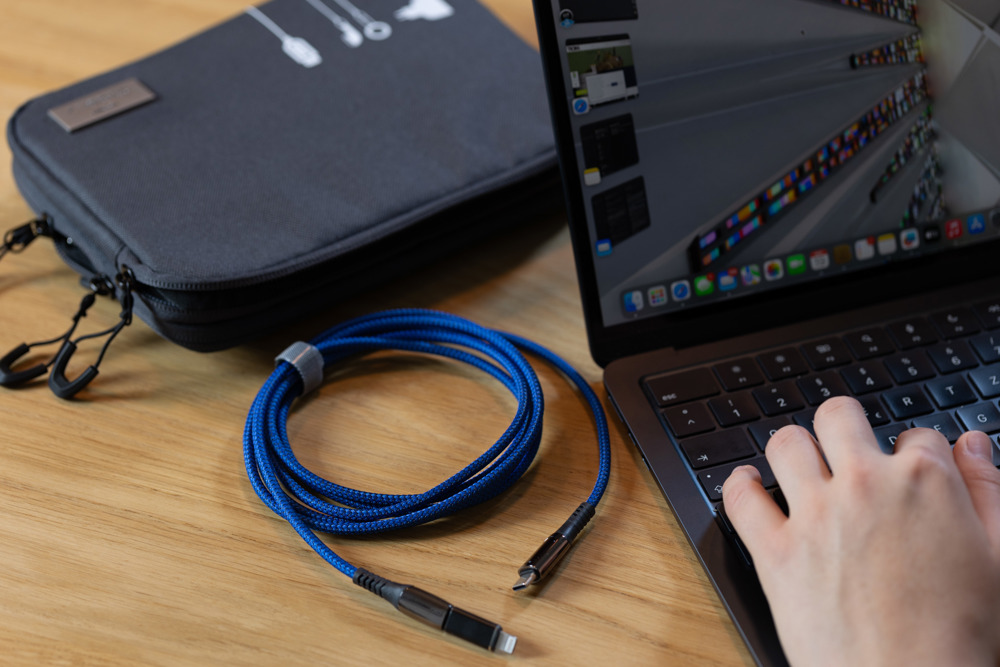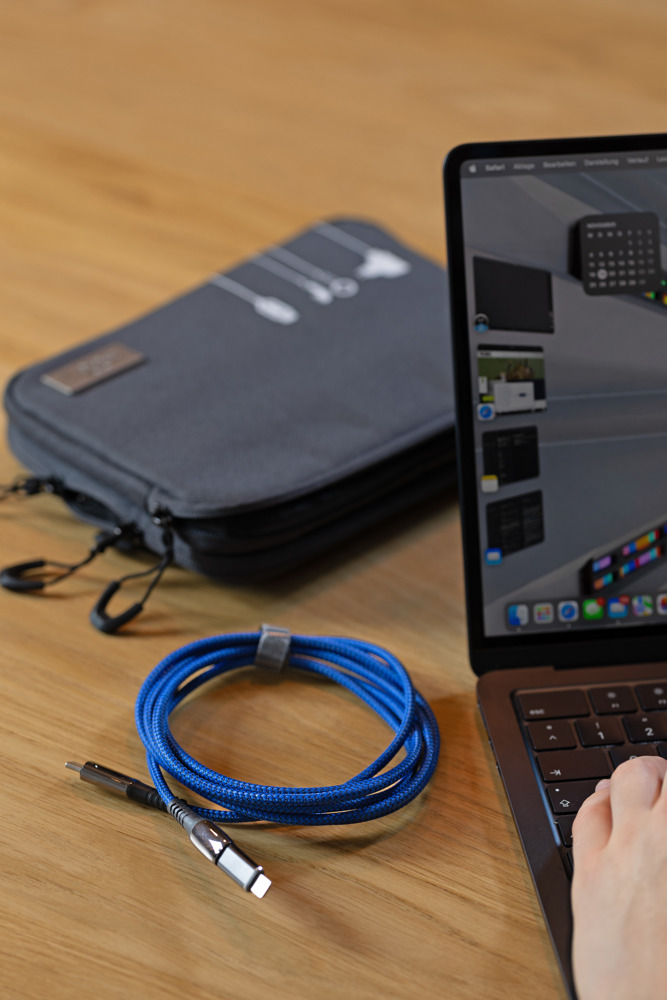 Ladekabel High-Speed USB-C 100W PD Power Delivery auf USB-C, mit Datenübertragungsfunktion, volle Ladekapazität: max. 100W|20V|5A (ohne Adapter), abhängig vom zu beladenen Gerät, mit digitaler Anzeige der Ladeleistung, inkl. USB-C auf Lightning Adapter, Kabel textilummantelt (Netzstruktur), recyceltes Polyester, 2m Länge, Metall, Polyester, blau/gunmetal