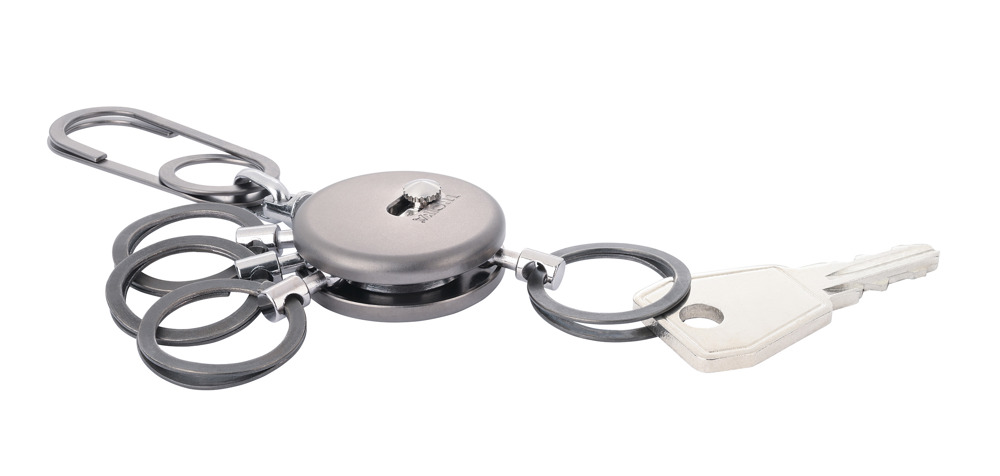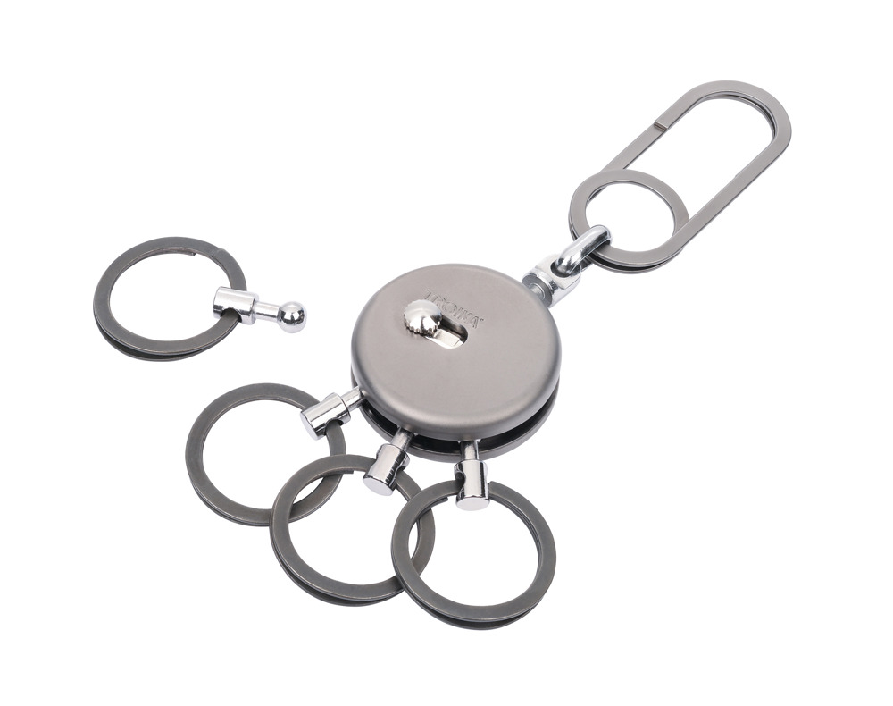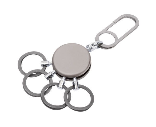 Schlüsselanhänger, rund, inkl. Karabinerhaken, 4 ausklinkbare Ringe, schnelles & einfaches Anbringen der Schlüssel dank patentiertem Öffnungsmechanismus (TROIKA NAIL GUARD), Messing, Metall, verchromt, matt, gunmetal