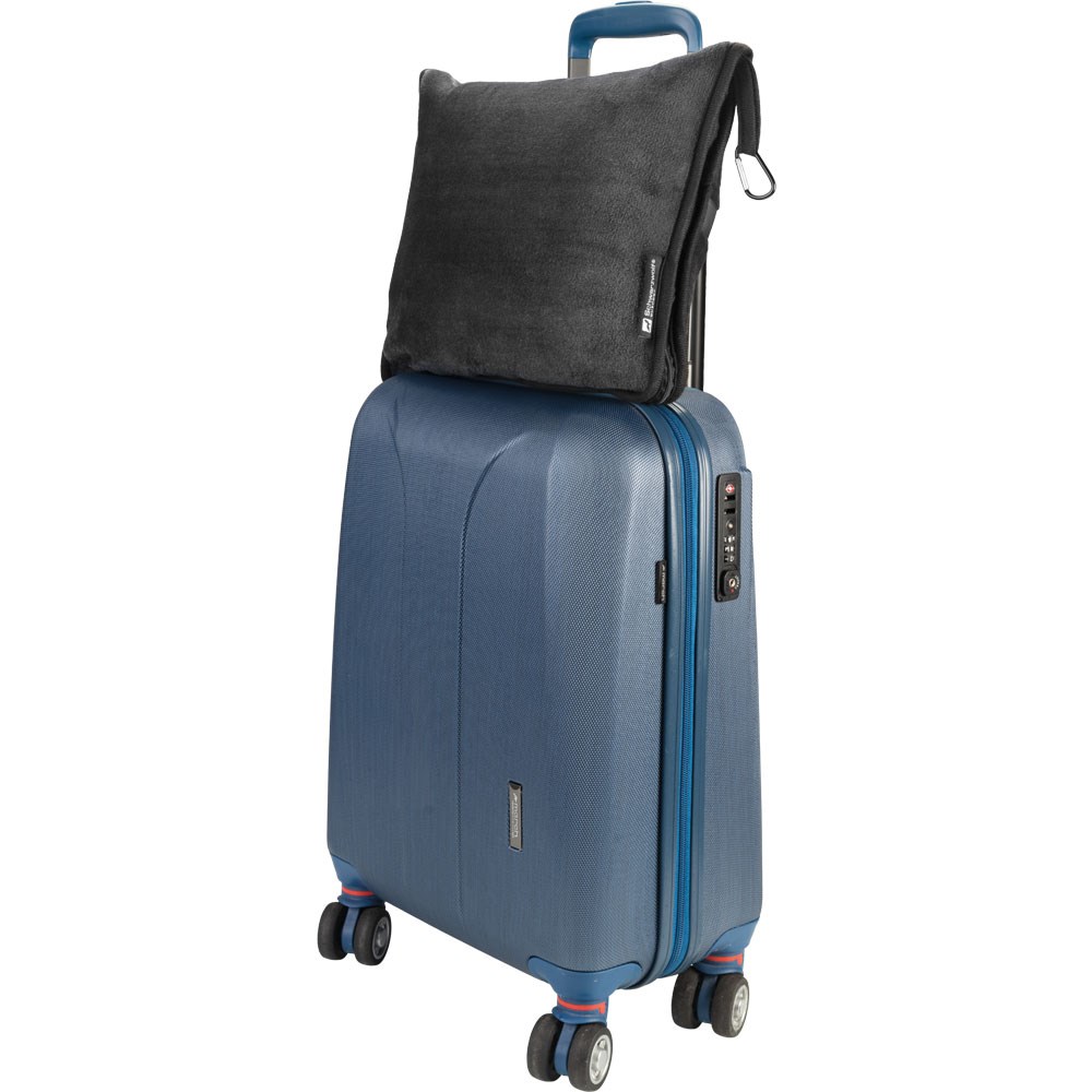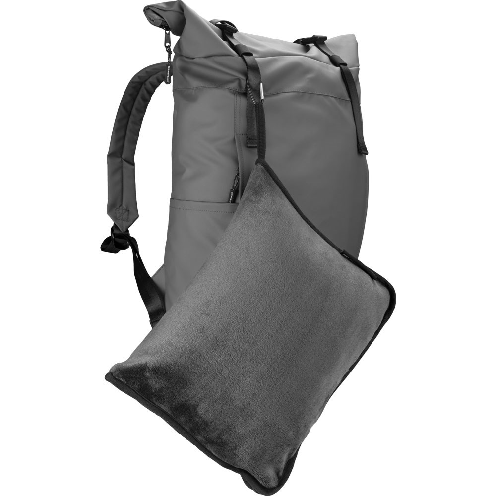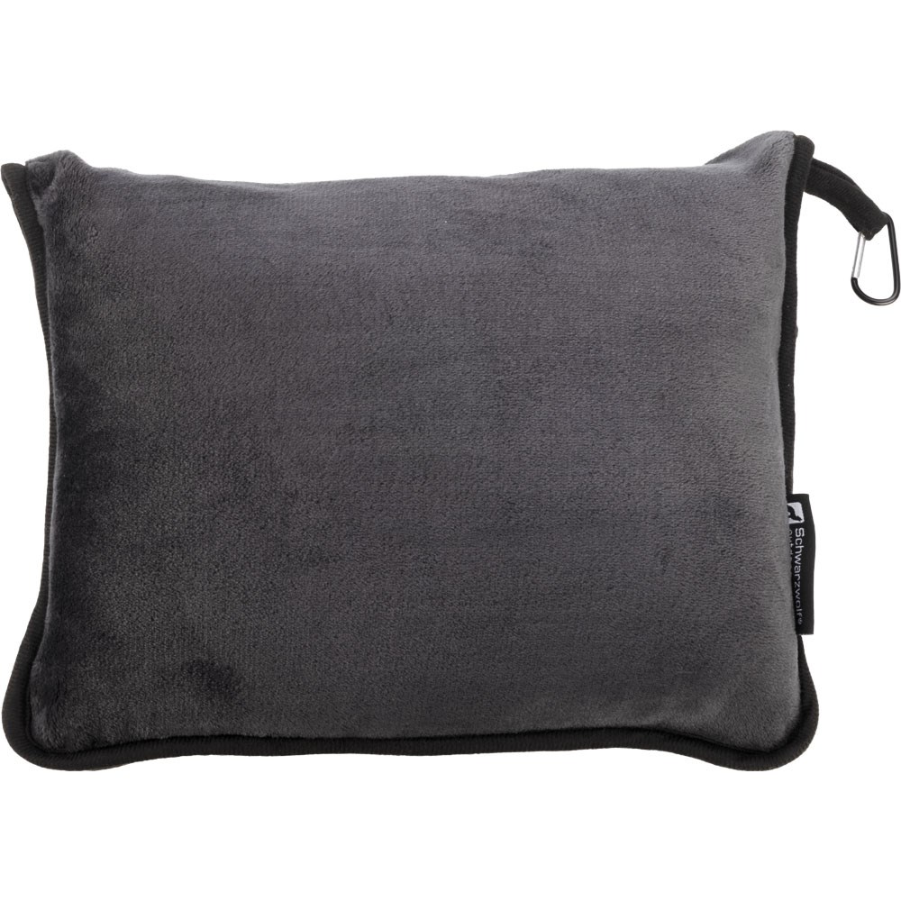 Schwarzwolf outdoor 2in1 Fleece-Reisedecke, die als Decke verwendet oder in eine Hülle aus dem gleichen Material gefaltet in ein bequemes Kissen verwandelt werden kann. Die Decke ist in Dunkelgrau gehalten und kann auf Reisen verwendet oder als Begleiter beim Camping. Die Hülle für die gefaltete Decke enthält einen Karabiner zum Befestigen am Gepäck.