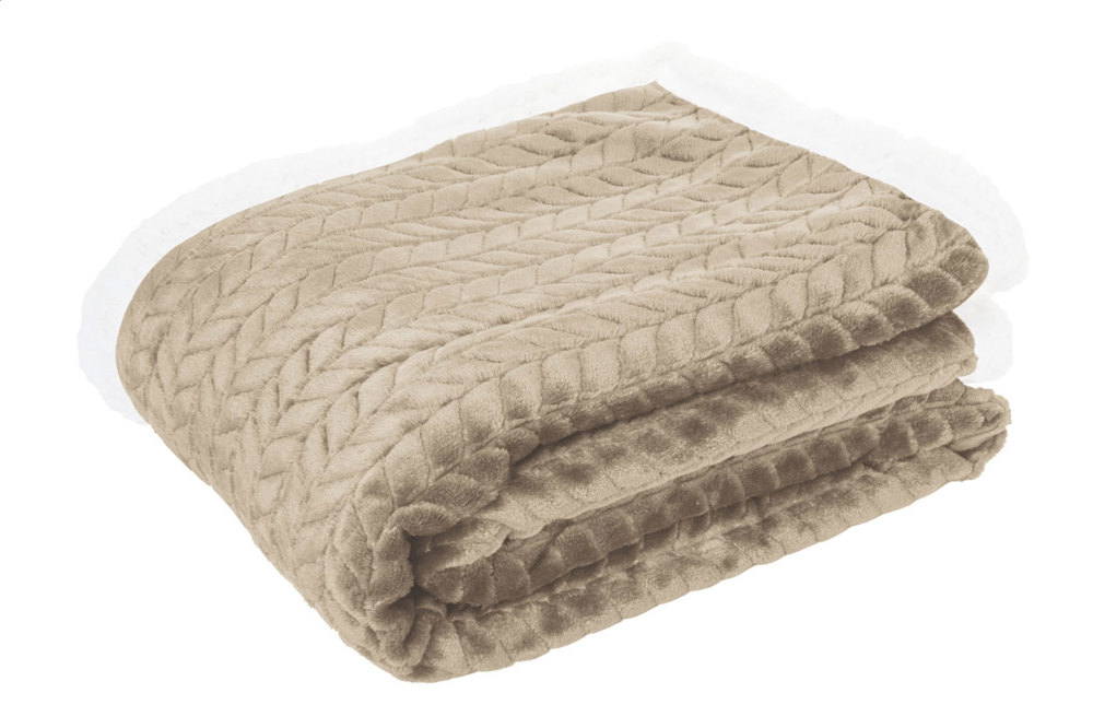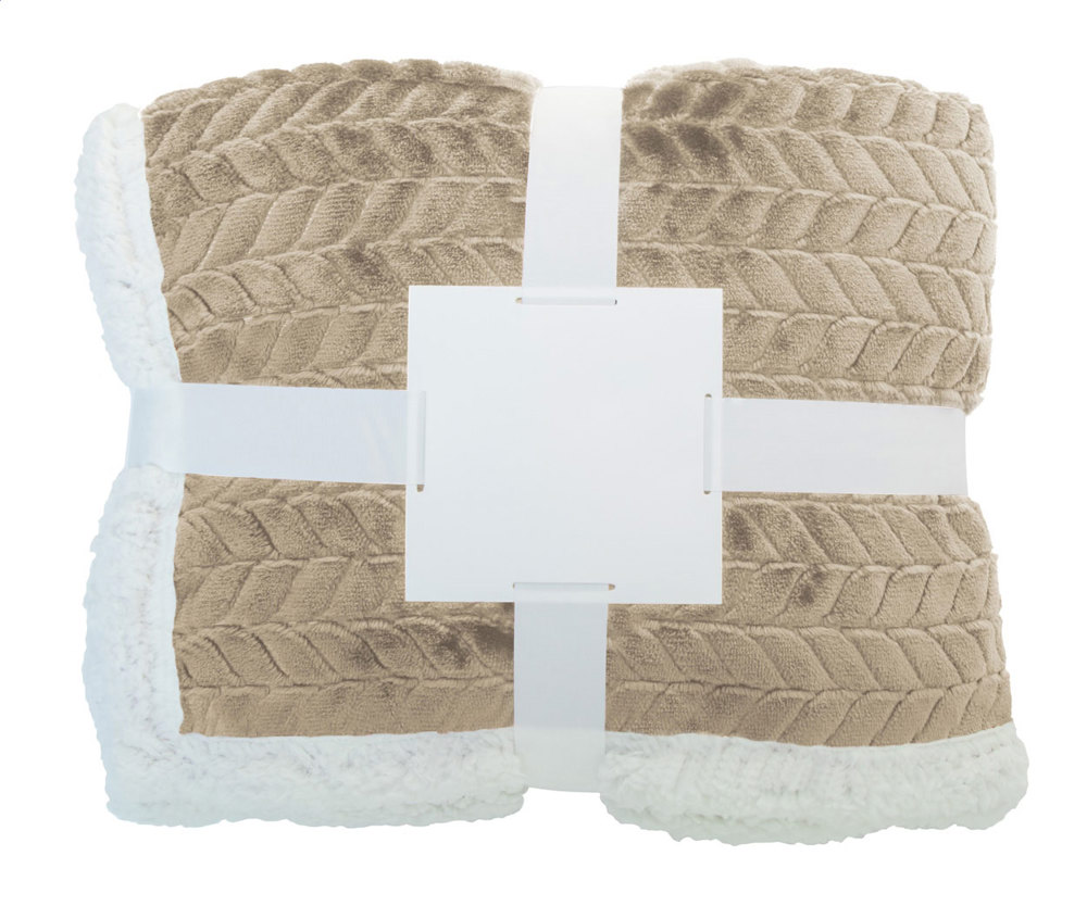 Zweilagige RPET-Decke mit Jacquardmuster. Mit 240 g/m² RPET-Flanellfleece und wendbarem 210 g/m² RPET-Sherpa-Fleecefutter. Eingewickelt mit einem Band und bedruckbarer Papierkarte.