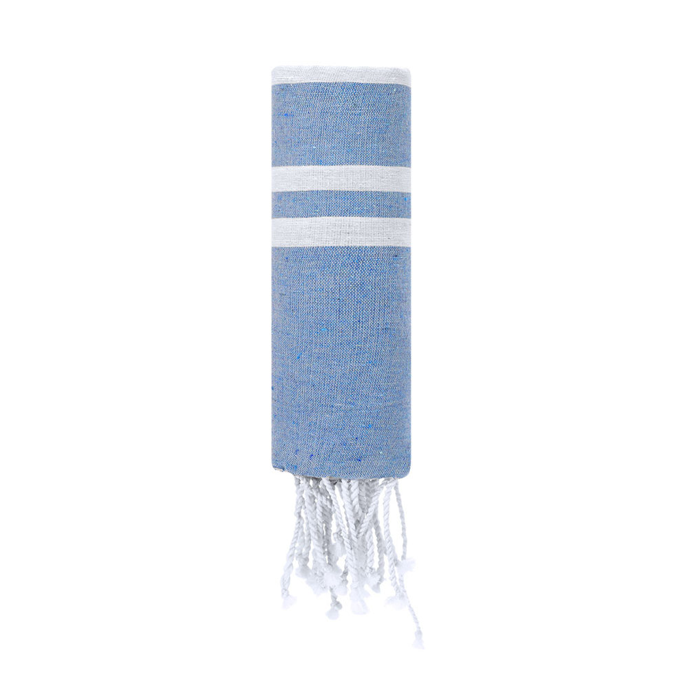 Weicher Pareo-Handtuch von 150 g/m2 in einer Kombination aus Baumwolle und Polyester. Sein Design hat einen bunten Hintergrund mit weißen Streifen. Enthält Fransen an den Enden, die ein dekoratives Detail hinzufügen und den Abschluss vervollständigen.