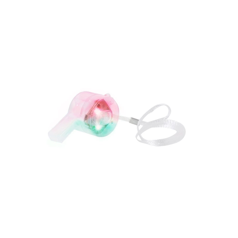 Leuchtpfeife mit mehrfarbigen LEDs, die mehrere Beleuchtungsmodi bietet: langsames, mittleres oder schnelles Blinken, angepasst an verschiedene Umgebungen. Inklusive praktischem Ein/Aus-Schalter. Inklusive Kordel für bequemen Transport und funktioniert mit drei Knopfzellen (inbegriffen).