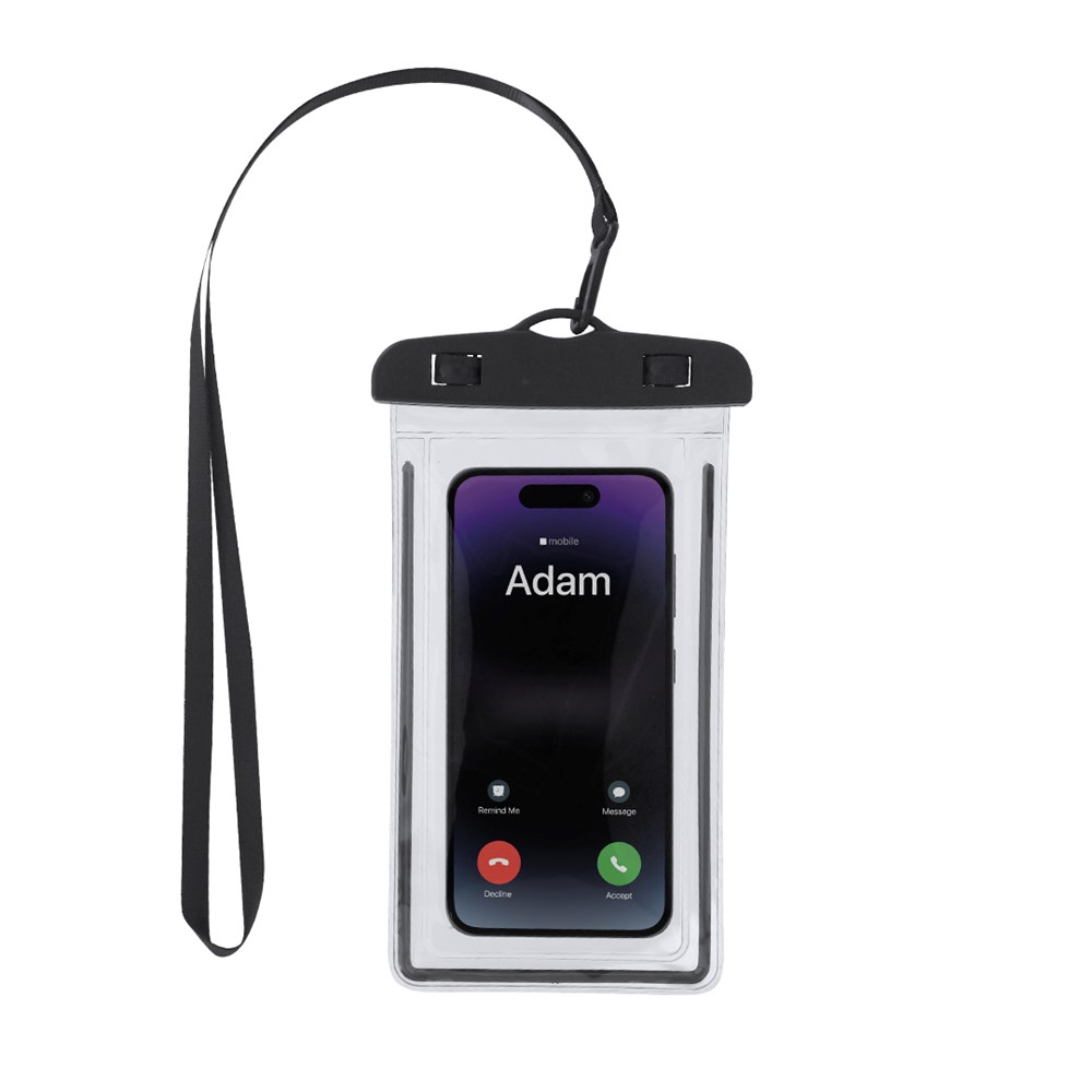 Wasserdichte Tasche aus PVC, entworfen mit Touch-Funktion für die einfache Nutzung von Geräten. Mit Sicherheitssystem und Klappverschluss für gute Dichtigkeit. Kompatibel mit Bildschirmen bis zu 6,7 Zoll. Enthält passendes Band und Karabiner für zusätzlichen Komfort.
