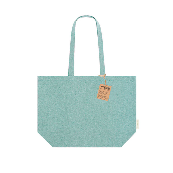 Tasche hauptsächlich hergestellt aus 220 g/m2 recycelter Baumwolle mit Bodenfalten. Lange 70 cm-Griffe mit Verstärkung, genäht. Logo am seitlichen Etikett und Tragfähigkeit bis zu 6 kg.