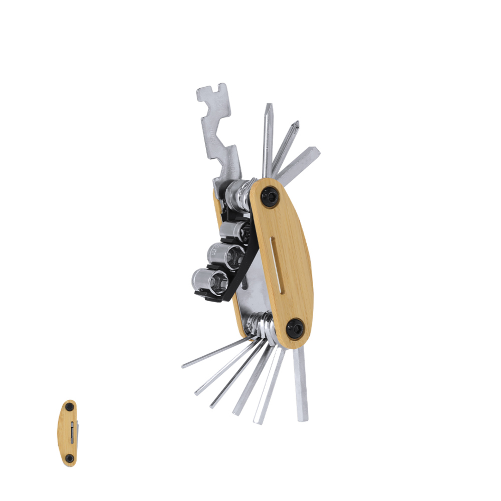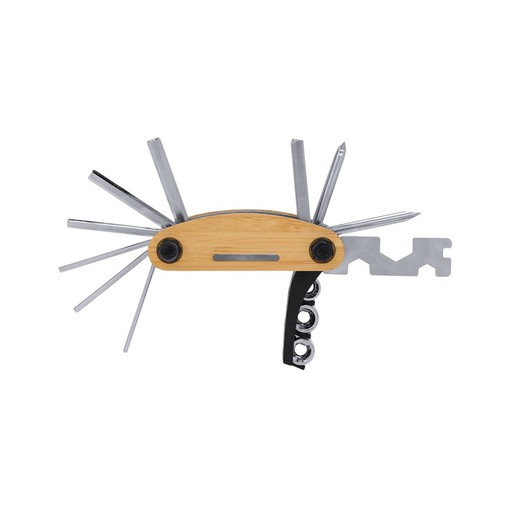 Multitool aus robustem Edelstahl mit Bambusgehäuse. Mit 15 Funktionen:- Innensechskantschlüssel- Sechskantschlüssel- Flachschraubendreher- Sternschraubendreher- Phillips-Schraubendreher- Rohradapter für sechseckige Schrauben- SteckschlüsselMaterialien wie Bambus fördern die Nutzung natürlicher Rohstoffe und reduzieren die Schadstoffemissionen. Stammt von einer widerstandsfähigen und vielseitigen Pflanze, die schnell wächst und regeneriert, und ist eine hervorragende Alternative zur Verwendung von herkömmlichem Holz.
