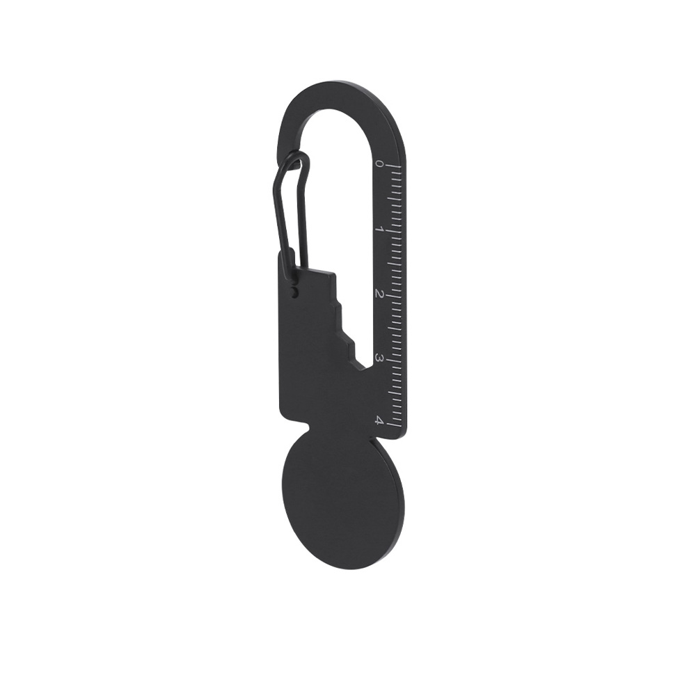 Multitool aus rostfreiem Stahl mit mattschwarzem Finish. Entworfen zur Anpassung an verschiedene Bedürfnisse, umfasst 8 Funktionen: Schlüssel für Sechskantmuttern in verschiedenen Größen, Maßstab für Messungen, Flaschenöffner, Münze für Einkaufswagen usw. Mit Karabinerverschluss.
