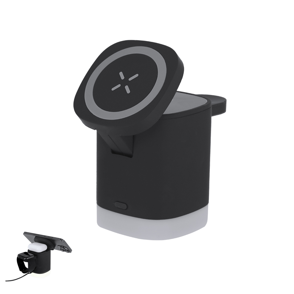 Magnetisches drahtloses Ladegerät 3-in-1 von 15W, hergestellt aus recyceltem ABS (RABS). Entwickelt für die gleichzeitige Ladefunktion des Smartphones, der Ohrstöpsel und der Smartwatch.Verfügt über eine integrierte Lampe in der Basis mit 2 einstellbaren Lichtmodi in Weiß.Typ-C-Kabel enthalten. Ein All-in-One-Gerät: faltbar, tragbar, vielseitig und funktional im Design.RAB ist ein hochgradig recycelbarer Kunststoff von großer Festigkeit und mit zahlreichen Anwendungen, der es zu einer umweltfreundlichen Lösung macht.Hergestellt gemäß den RoHS-Standards und in Übereinstimmung mit den folgenden Sicherheitsanforderungen:Schutzsystem gegen Überhitzung.Schutzsystem gegen Überladung.Verriegelungssystem zur Vermeidung von Kurzschlüssen.