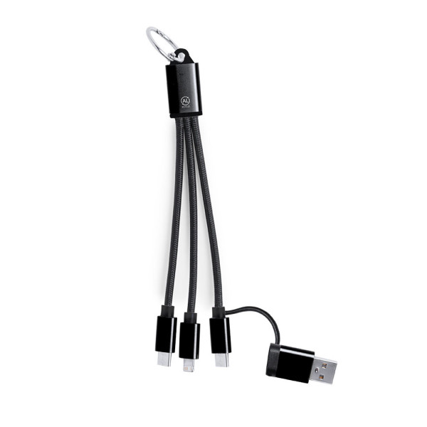 Ladekabel aus recyceltem Aluminium. Mit dualem Typ-C/USB-Eingang und Ausgängen Typ-C, Lightning und Micro-USB. Enthält ein Zeichen für recyceltes Aluminium.Recyceltes Aluminium ist ein Material mit nahezu unendlichen Recyclingmöglichkeiten, ohne dabei seine ursprünglichen Eigenschaften zu verlieren und weniger Energie in diesem Prozess zu verbrauchen.GRS-Zertifizierung (Global Recycled Standard), die die recycelte Herkunft des für die Herstellung des Produkts verwendeten Materials garantiert.Micro-USB-, Typ-C- und Lightning-Anschluss 5V DC 2.4A