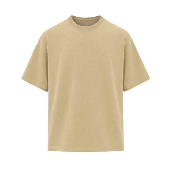 Oversize T-Shirt mit kurzen Ärmeln aus 200 g/m² Baumwolle. Kragen aus 1x1-Rippstrick mit Elastan und Nahtüberdeckung. Mit seitlichen Nähten.