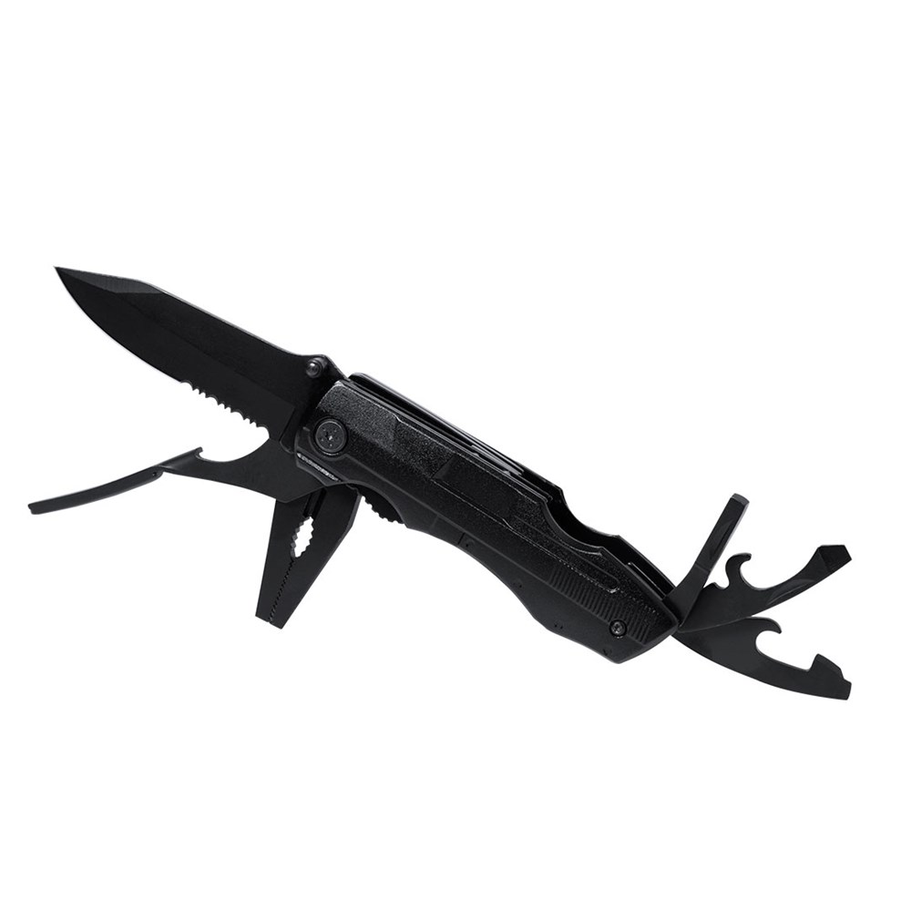 Multifunktionsmesser mit schwarzem Edelstahl-Finish und passendem, strapazierfähigem Aluminium-Griff. Klappbares Design und kompakte Größe. Enthält 10 Funktionen: - Schraubendreher mit verschiedenen Köpfen- Glattes und gezacktes Messer- Flaschenöffner- Dosenöffner- Zange mit FadenabschneiderPräsentiert in einer praktischen Polyesterhülle passend mit Gürtelclip.