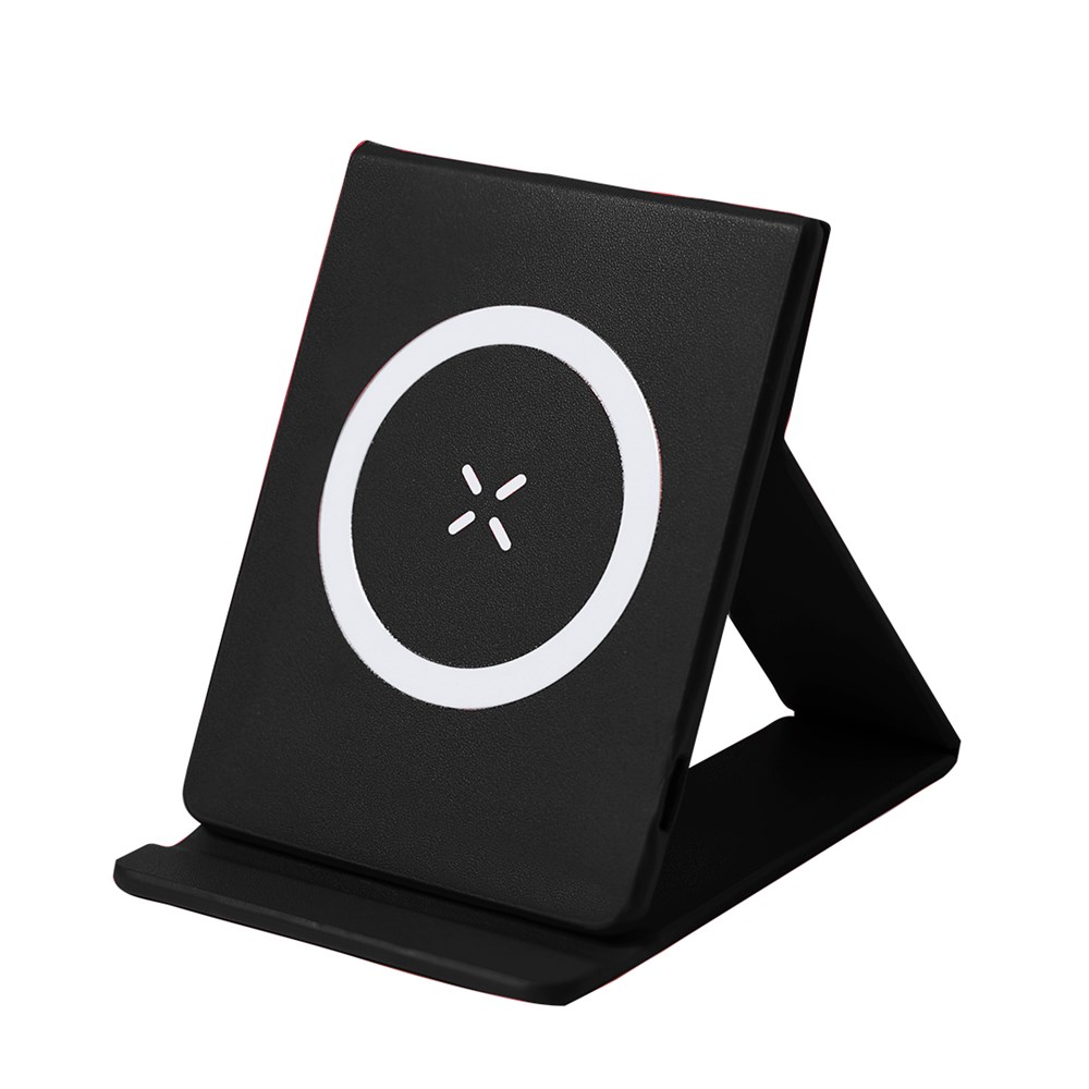 Kabelloses magnetisches Ladegerät 15W, hergestellt aus PU. Enthält einen klappbaren Halter mit der Möglichkeit verschiedener Positionen des Smartphones und Anzeige des Ladezustands. Kompatibel mit kabellos ladenden Geräten. Enthält ein 1m USB-Ladekabel mit Typ C Eingang und einen Metallring mit Kleber. Bedienungsanleitung in Spanisch und Englisch verfügbar.