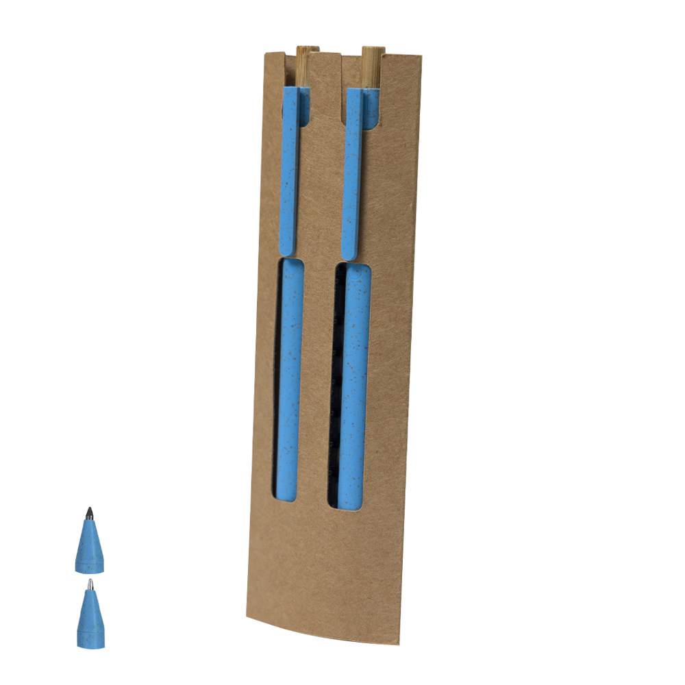 Set aus Tintenroller und ewigem Bleistift, hergestellt aus Weizenstroh und Bambus. Tintenroller mit Druckmechanismus aus Bambus in blauer Tinte und passendem Clip. Und Bleistift mit Druckmechanismus aus Bambus und ewiger Mine, um immer denselben Bleistift zu verwenden und Abfall zu vermeiden. Präsentiert in einer Schachtel aus recyceltem Karton. Mit gedrucktem Weizenstroh-Symbol.Hergestellt aus pflanzlichen Materialien, um die Verwendung von natürlichen Rohstoffen zu fördern und die Schadstoffemissionen zu reduzieren.