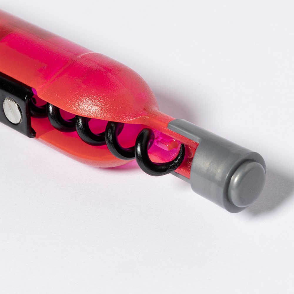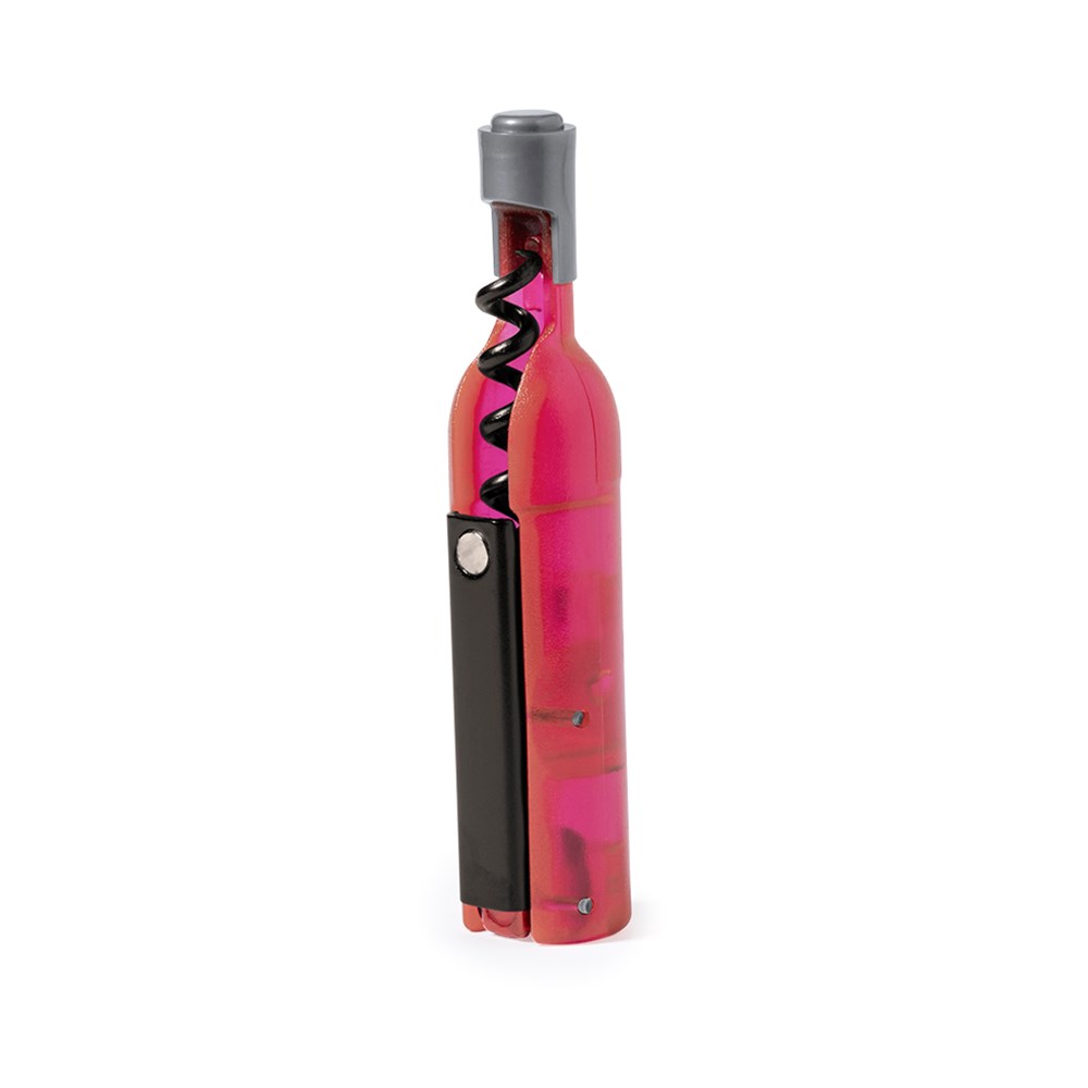 Lustiger magnetischer Korkenzieher in Form einer Weinflasche in weißer, roter und rosé Ausführung. Mit Körper in halbtransparenter Ausführung mit Flaschenöffner.