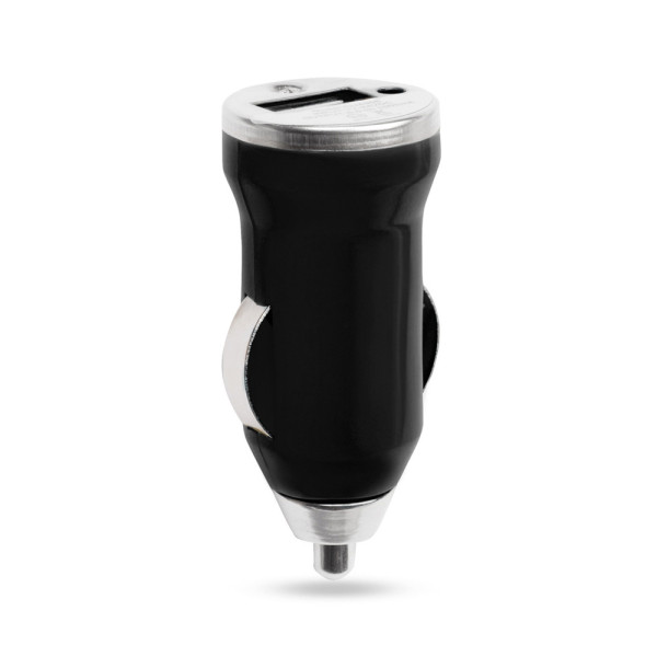 USB-Ladegerät für den Zigarettenanzünder im Auto. 1.000 mA Ladekapazität in leuchtenden Farben. Cover in Metallic-Optik mit LED-Ladeanzeige, präsentiert in einer Einzelbox.