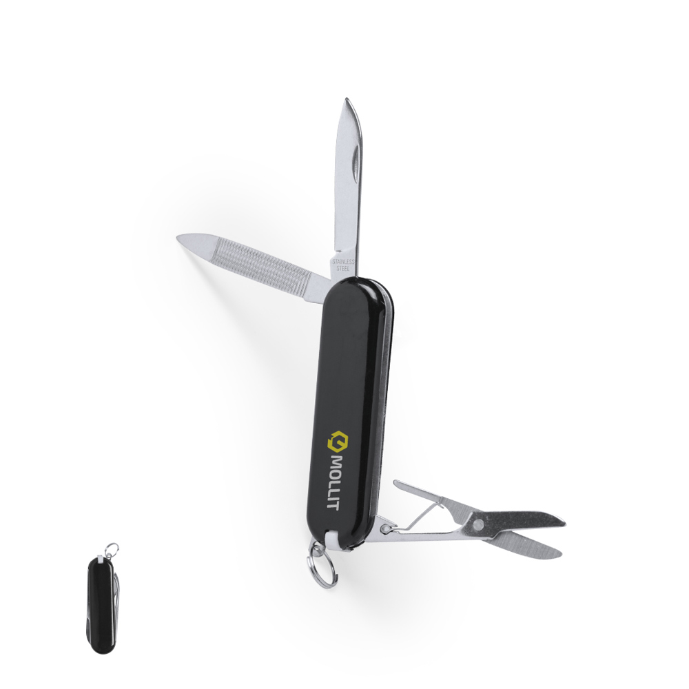 Vielseitig verwendbares Mini-Taschenmesser in verschiedenen Farben mit 6 Edelstahl-Funktionen. Enthält Messer, Pinzette, Feile, Zahnstocher, Schlüsselring und Schere. Präsentiert in einer individuellen Box.